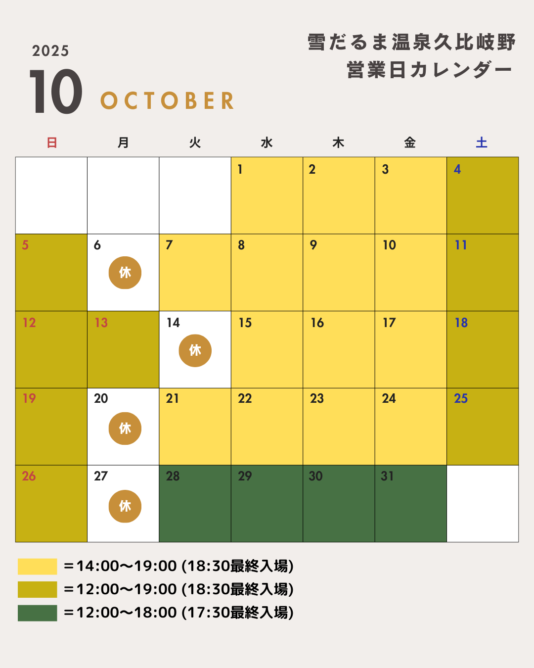 10月温泉休館日