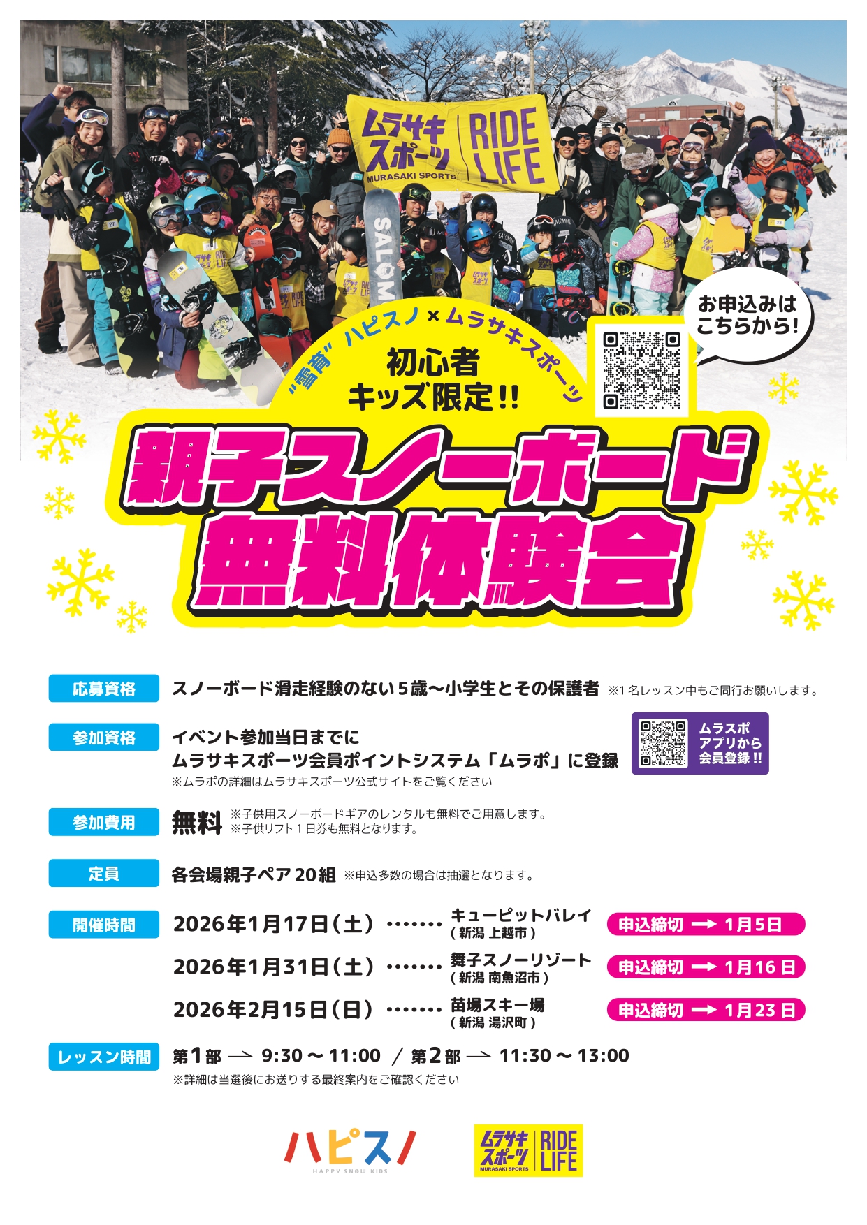 “雪育”ハピスノ×ムラサキスポーツ「初心者キッズ限定! 親子スノーボード無料体験会」を
