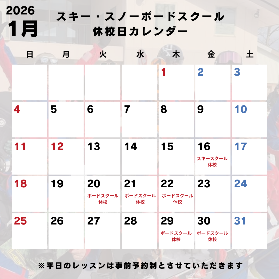 団体様受け入れのため、下記日程はスキースクール・ボードスクールを休校とさせていただきます。