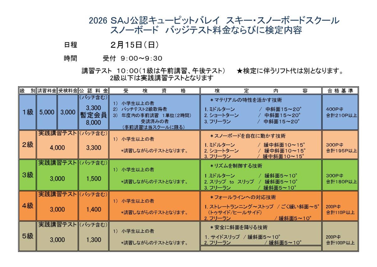 ボードバッジテスト 26.01.12 スノーボードスクールよりお知らせいたします。2月15日(日)スノーボードバッジテストを行います。検定内容・料金は下記をご確認ください。お問い合わせ:スノーボードスクール070-1303-6937 « 前の記事次の記事 »一覧へ戻る NEW「湯沢中里スノーリゾート」2025年12月28日(日)より営業開始